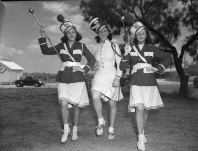 Friends from of upwards of 150 miles thronged to Throckmorton's twelfth annual County Fair and Rodeo. Three Vernon High School girls will lead their school band in the parade. They are left to right, Doris Tinker, Willadean Jackson, and Melva McCracken, leaders of the Vernon High School band. They are dressed in band uniforms and hats. Doris and Melva are baton twirlers while Willadean is the drum major.