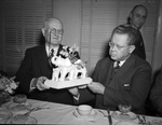 Even the party mascot is present Tuesday night at the Hotel Texas for the Republican Rally. Members of the State Republican Executive Committee are being entertained by the Tarrant County Republican Club. Examining the elephant that decorated the table are R. B. Creager, left, and Colorado Governor Ralph L. Carr. Mr. Creager, of Brownsville, Texas, is the national committee man. He is wearing a three piece suit and Pince-nez glasses. Governor Carr is the speaker for the state rally. He is dressed in a double breasted three piece pinstripe suit.