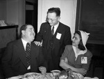 The Republican Party is holding a rally at the Hotel Texas for members of the State Republican Executive Committee. Arnold Davis is welcoming Mr. and Mrs. Eugene Nolte of San Antonio, Texas. Mr. Davis is the secretary of the county headquarters committee. He is standing, wearing a double breasted three piece, pinstripe suit. Mr. Nolte is a county chairman of Bexar County. He is dressed in a double breasted suit. Mrs. Nolte is wearing a scarf in her hair, a dress, and a brooch.