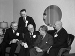 Texas Republican leaders are shown talking over their 1940 chances with a brother Republican from Colorado. They are attending a Republican interstate gathering at the Hotel Texas. They are left to right, Orville Bullington, R. B. Creager, Governor Ralph L. Carr and Hugh E. Exum. Standing is Arnold Davis. Mr. Bullington, of Wichita Falls, Texas, is a member of the State Executive Committee. He is wearing a suit. Mr. Creager, of Brownsville, Texas is a national committee man. He is dressed in a three piece suit and Pince-nez glasses. Colorado Governor Carr is dressed in a double breasted, three piece pinstripe suit. Mr. Exum, of Amarillo, Texas, is chairman of the State Executive Committee. He is wearing a dark colored suit. Mr. Davis is the headquarters chairman for the Tarrant County Republican Club. He is dressed in a three piece suit. There is a mirror hanging on the back wall.