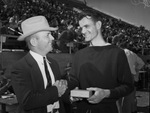 The Southwestern Exposition and Track Meet kicked off Friday in Fort Worth, Texas. H. V. Wright, is an independent entry from Waurika, Oklahoma. He was formerly a track star at Oklahoma A&M. Wright won the pentathlon event at Farrington Field. He is being congratulated by Dutch Meyer, head football coach at Texas Christian University. Wright is wearing a sweatshirt and sweatpants. Coach Meyer is wearing a cowboy hat and a suit. The bleachers of Farrington Field are filled with spectators.