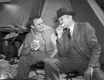 The Southwestern Exposition and Track Meet kicked off Saturday in Fort Worth, Texas. Two famous University of Texas guys are taking time out for lunch. They are left to right, Jack Crain and Clyde Littlefield. Crain is a footballer. His sweatshirt is slung over his shoulders and he is wearing sweatpants. Littlefield is the Longhorns' track coach and former football coach. He is wearing a hat and a three piece tweed suit. They are eating their lunch in front of the University of Texas tent.