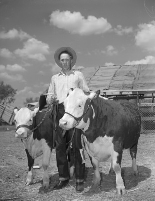Friends from of upwards of 150 miles thronged to Throckmorton's twelfth annual County Fair and Rodeo. H. L. Martin is posing with two of the several calves he is exhibiting at the fair. On the left is "Tex," a calf bred by R. A. Brown. Tex won first in the junior dry lot division. "Sleepy," on the right, also came from the Brown herd and was among Mr. Martin's second prize winning animals. Mr. Martin is dressed in a tilted cowboy hat, striped dress shirt, cuffed jeans, and cowboy boots.
