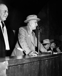 Southwestern Exposition and Fat Stock Show. Sale of Champions. Amon Carter, at the mike in the role of auctioneer. To the right of Mr. Carter is a Earl Gartin of Greensburg, Indiana. The men are wearing suits and tie and Mr. Gartin is wearing eyeglasses, and a shawl on his neck while Mr. Carter has a hat. Mr. Carter is resting his hands on the table in front of him as he speaks while Mr.Gartin smiles and looks on. There are other unidentified men seated on chair beside the two men standing.