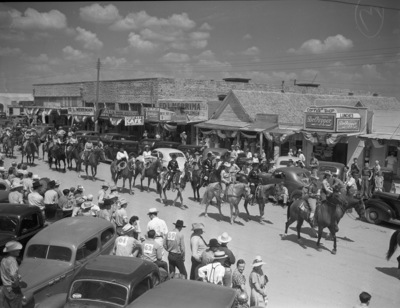 Friends from of upwards of 150 miles thronged to Throckmorton's twelfth annual County Fair and Rodeo. Nearly the entire ranch population of the county is out on the street for the opening day parade. Like any West Texas town, good horses are mounted by cowboys and cowgirls. The street is crowded with spectators and parked automobiles. Several of the stores have Dr. Pepper signs on the marquee. There is a coffee shop, café, shoe store, and a variety store.