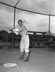 Fort Worth, Texas, amateur baseball player Davey O'Brien shown at the bat. He plays for the Worth Clothiers. O'Brien is standing on a field, wearing a baseball uniform. He has a bat raised up behind him, ready to swing. Behind him is a large fence and bleachers for spectators.