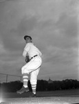 Fort Worth, Texas, amateur baseball player Pat McCoy, pitcher for Willard Battery. McCoy is standing on a pitcher's mound, about to throw a ball. He is wearing a baseball uniform, including a baseball cap and baseball glove. There are several trees in the background.