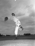 Fort Worth, Texas, amateur baseball player Drew Jones, right-handed pitcher, playing for Wolf and Klar. Jones is shown in the midst of a pitch from atop the pitcher's mound. His left leg is raised. He is wearing a baseball uniform, including a baseball glove and baseball cap.