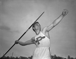 Bob Henderson, Polytechnic High School spear-thrower. He is wearing a sleeveless shirt and shorts and is holding a spear in his right hand. His left arm is outstretched forward. Henderson threw a distance of 158 feet, five inches, in the last district track meet.