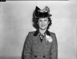 Mrs. Ray Lawrence, of Big Spring, Texas, director of the review of the annual West Texas Chamber of Commerce convention, to be held at Big Spring, Texas, on May 16, 17 and 18, 1940. She is standing against a blank wall, wearing a plaid overcoat, a necklace and a hat. There are flowers pinned to the lapel of her coat.