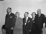 Members of the reception committee who are preparing for the annual West Texas Chamber of Commerce convention, to be held at Big Spring, Texas, on May 16, 17 and 18, 1940. The members are, left to right, Carl Broomshield, Mrs. G. C. Dunham, G. C. Dunham, Mrs. Carl Broomshield and R. L. Cook. They are standing against a blank wall. Mr. Broomshield is wearing a double-breasted suit. Mrs. Dunham is wearing a dress and an overcoat. Mr. Dunham is wearing a suit, a plaid necktie and eyeglasses. Mrs. Broomshield is wearing a blouse, a pinstripe blazer with matching skirt, and a hat. She is carrying a handbag. Mr. Cook is wearing a three-piece suit and eyeglasses.