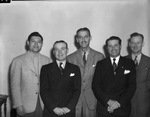Members of the registration committee who are preparing for the annual West Texas Chamber of Commerce convention, to be held at Big Spring, Texas, on May 16, 17 and 18, 1940. The members are, left to right, A. Swartz, Pat Kenney, R. R. McEwen, D. D. Douglass and Joe Pond. The men are standing against a blank wall, all wearing suits.