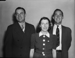 Members of the entertainment committee who are preparing for the annual West Texas Chamber of Commerce convention, to be held at Big Spring, Texas, on May 16, 17 and 18, 1940. The members are, left to right, Bill Tate, chairman, Mary Whaley, and Matt Herrington, assistant manager of the Big Spring Chamber of Commerce. They are standing against a blank wall. Tate is wearing a double-breasted, pinstripe suit. Miss Whaley is wearing a checkered dress that has buttons down the bodice. Herrington is wearing a suit and a plaid necktie.