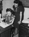 Edith Gay, left, and Marie Jennings, secretary and assistant secretary, respectively, to the manager of the Big Spring Chamber of Commerce, shown preparing for the annual West Texas Chamber of Commerce convention, to be held at Big Spring, Texas, on May 16, 17 and 18, 1940. Miss Gay is sitting at a desk and writing on a sheet of paper with a pencil. She is wearing a floral print dress. Miss Jennings is standing behind her. She is wearing a knit dress. At the right is a filing cabinet.