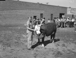 J. W. Jackson Junior with his calf that became the reserve champion of the Wilbarger County 4-H Club show in Vernon, Texas. He is wearing a collared shirt and trousers. Several people are standing in the background in front of a building. Posted on the building, at the far right, is an advertisement for Coca-Cola.