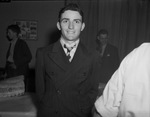 Joe Cardwell, 18, son of Mr. and Mrs. H. T. Cardwell, at the Wilbarger County 4-H Club show in Vernon, Texas. Joe is president of the club. He is wearing a double-breasted, pinstripe suit.