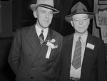 Attendees at the East Texas Chamber of Commerce Convention in Marshall, Texas, included Sam E. Wood, president of the Marlin (Texas) Chamber of Commerce, and Abb O. Brabham, of Atlanta, Texas. The two men are shown standing shoulder to shoulder and smiling. Mr. Wood is wearing a double breasted, striped suit with a patterned tie and Mr. Brabham is wearing an unbuttoned jacket with a striped tie. Both are wearing brimmed hats and have name tags pinned onto their suit lapels. Mr. Wood also has a ribbon that reads "reception," under his name tag.