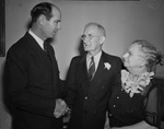 Mr. and Mrs. Hurd Wren were honored at a celebration of their 50th wedding anniversary at Texas Wesleyan College. Law Sone, left, president of Texas Wesleyan College, is standing with the couple in front of an empty wall. Mr. Wren and Mr. Sone are shaking hands. Both men are wearing buttoned-up suits and Mrs. Wren is wearing a blouse with floral accessories around the collar. The couple are looking up at Mr. Sone and smiling. The Wrens were honored by the college and Polytechnic Methodist Church.