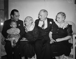 Four generations of the Wren family photographed during a celebration of Mr. and Mrs. Hurd Wren's 50th wedding anniversary. The family members are all seated on a couch in front of a blank wall. J. Allen Wren, left, son of the couple, is holding his 14-month-old daughter, Janey Wren. Mrs. Mattie Wren, 94, mother of Hurd Wren, is seated between J. Allen and Hurd. Mrs. Hurd Wren is at the right. Mrs. Mattie Wren and the couple are all looking at baby Janey. J. Allen looks on. The men are wearing suits and the women are wearing long, dark dresses with floral accessories. The celebration was held at the Texas Wesleyan College parlor.