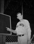 The Fort Worth Cats manager Bob Linton is pointing to a bulletin board, inviting fans to LaGrave Field for the Cats home opener. Linton is wearing his Cats' uniform and holding a baseball bat.