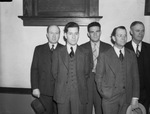 Spur Roundup and Rodeo Reception committee (left to right) N. A. Chastian, Joe Long, Truman J. Green, W. F. Gilbert and W. T. Andrews, seen standing side by side each other against a wall, wearing suits.