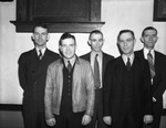Spur Roundup and Rodeo Entertainment committee (left to right) T. E. Milam, Cap McNeil, E. S. Lee, H. P. Gibson and Clyde Walthall, seen standing side by side each other wearing suits.