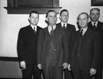 Spur Roundup and Rodeo Reception committee (left to right) Marshall Formby, G. H. Snider, O. B. Ratliff, Cuba White and E. D. Cook, Seen standing side by side each other against a wall, all wearing suits.