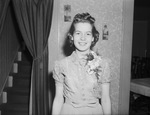 Ouida Johnston, of Eskota, Texas, daughter of Mr. and Mrs. C. B. Johnston, 4-H Club worker. She has done 4-H Club work for seven years. She is wearing a dress with buttons down the front of the bodice and short sleeves made of a lace material. Flowers are pinned to the dress by her left shoulder. A staircase can be seen behind her.