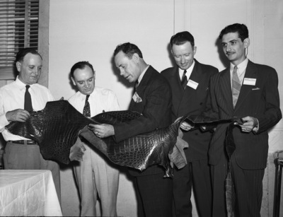 Texas Southwestern Association of Master Shoetricians Annual Meeting. Left to right, B. B. Beck, Amarillo, Texas; and his twin brother, Earl C. Beck, Fort Worth, Texas; Bob Mills of Brantley's Boot shop, Sweetwater; C. M. Barfield of Austin, Texas; and S. J. Maida of Houston, Texas. All three men are seen looking at leather.