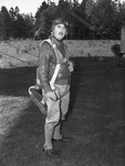 Major William C. Farnum, commanding officer of the First Balloon Squadron, ready and suited up to go on an observation mission. His uniform includes a coat, trousers, aviator hat and goggles.
