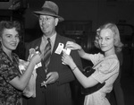 Among the thousands who attended the West Texas Chamber of Commerce convention at Big Spring, Texas, were, left to right, "Skippy" King, of Midland, Texas, Earl P. Hall, of Henrietta, Texas, and Louise Motoyl, also of Midland, Texas. Misses King and Motoyl are wearing floral print dresses. Hall is wearing a pinstripe suit, a hat and eyeglasses. The young women are pinning badges that read "Midland," on either side of Hall's suit jacket. Miss King has a newspaper tucked under her arm. Hall is holding a cigarette in his left hand. Miss Motoyl has a handbag tucked under her left arm.