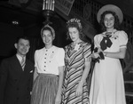 Among the thousands who attended the West Texas Chamber of Commerce convention at Big Spring, Texas, were, left to right, Floyd Graham, director of the Denton Chamber of Commerce, Longino Berly, sponsor for Texas State College for Women, Theresa Corcoran, sponsor for North Texas State Teachers College, and Nancy Jamee Gates, sponsor for Denton High School. Graham is wearing a double-breasted suit. Miss Berly is wearing a button-down blouse and a striped skirt. Miss Corcoran is wearing a striped dress and has a watch on her left wrist. Miss Gates is wearing a dress and a hat. She has a watch on her left wrist and is holding a pair of gloves.