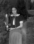 Betty O'Mara, 17, of Lubbock, Texas, holding the trophy she won in the "My Home Town" contest at the West Texas Chamber of Commerce convention at Big Spring, Texas. Miss O'Mara is wearing a blouse and a gingham skirt. She has a watch on her left wrist.