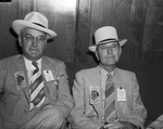 Among the thousands who attended the West Texas Chamber of Commerce convention at Big Spring, Texas, were, left to right, R. L. Brown, director from Muleshoe, Texas, and Percy Ralls, director from Ralls, Texas. They are sitting on a couch, both wearing suits, hats and eyeglasses.