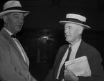Among the thousands who attended the West Texas Chamber of Commerce convention at Big Spring, Texas, were, left to right, Dean J. Thomas Davis, of John Tarleton College, at Stephenville, Texas, and B. Reagan, of Big Spring, Texas. Dean Davis is wearing a hat and a suit with a bow tie. Reagan is wearing a boater hat and a suit with a necktie. He is holding a newspaper.