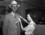 At the West Texas Chamber of Commerce (WTCC) convention at Big Spring, Texas, Elmer Fawcett, left, rancher from Del Rio, Texas, gets a badge pinned to his suit jacket by Miss Edith Gay, secretary to Manager J. H. Greene of the Big Spring Chamber of Commerce. Miss Gay is wearing a dress. Fawcett is wearing a suit and a hat.