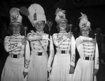 The drum major and majorettes heading the 70-piece Mineral Wells, Texas, band and delegation to the West Texas Chamber of Commerce convention at Big Spring, Texas. They are, left to right, Doris Mae Wells, Catherine Sims, drum major, Patsy Baughn and Inez Whorton. They are wearing their band uniforms and each holding a baton.