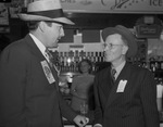 Among the thousands who attended the West Texas Chamber of Commerce convention at Big Spring, Texas, were Clyde L. Jones, left, manager of the Childress Chamber of Commerce, and H. S. Sanders, director of the Silverton Chamber of Commerce. Jones is wearing a suit and a hat. Sanders is wearing a double-breasted, pinstripe suit, a hat and eyeglasses. An unidentified woman is standing behind a counter in the background.