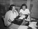 Southern Women's Golf tournament. Left to right, Estell Lawston Page of Chapel Hill, NC and Betty Jameson of San Antonio finished first and second place in the Women's Southern qualifying round at River Crest. They are also reporters, seen here in the press room on their type writers and checking their stories for the hometown papers. Published on May 21, 1940