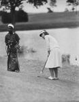 Southern Women's golf tournament. Betty Jameson , national champion, pitching to seventh green as the caddy looks on. Published on May 23, 1940.