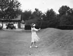 Southern Women's golf tournament. Betty Jameson, national champion, hits an approach shot from a bunker in front of 13th River Crest.
