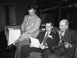 American Petroleum Institute visitors. Left to right, C. E. Miller, Tulsa, Okhlahoma, C. E. Reistle Junior, Houston, and L. A. Ogden, Fort Worth, are sitting on a sofa and checking an oil production problem. The man in the middle holds a document. The men are attending sessions of the Division of Production of the American Petroleum Institute here this week. Published on May 29, 1940.