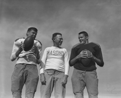 Football players from Masonic Home, September 3, 1940. Three unidentified players, can be seen standing next to each other, the two players on the side are holding a football each, and the one in the middle is wearing eyeglasses and a long sleeve shirt that reads, "Masons".