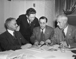 American Petroleum Institute committees were busy Sunday afternoon studying problems preliminary to the tenth mid-year. Left to right, H. O. Hill, Bethlehem, Pennsylvania, Walter Sanmans, Philadelphia, Turner C. Smith, Los Angeles, are sitting by a table and discussing, and C. C. Ashley, Shell Oil Co., Inc., San Francisco is the committee member standing behind, also looking at the documents and discussing. Published on May 27, 1940.