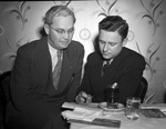 State Democratic convention in Waco. James E. Wheat of Woodville, left, and Price Daniel of Liberty, seen at a dinner table looking over some paper work.