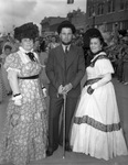 Floydada Rodeo and Floyd County Golden Jubilee Celebration. Left to right, Mrs. E. P. Nelson, Bill Norman and Mrs. A. J. Welsh, wearing the early day costumes they used in the parade.