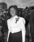 Floydada Rodeo and Floyd County Golden Jubilee Celebration. Mrs. Robert Graham, seen standing outside wearing a dress, as she appeared in Floyd County's fiftieth birthday celebration.