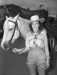 Floydada Rodeo and Floyd County Golden Jubilee Celebration. Miss Inez Jones, daughter of Mr. and Mrs. W. B. Jones of Floydada, seen standing outside in her cowgirls uniform next to her horse.