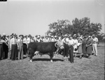 East Texas Hereford Association Tour. Herd bull at the W. J. Largent and Son, near Merkel, seen outside standing in a group of people behind the cattle.