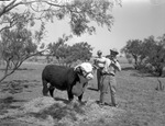 East Texas Hereford Association Tour. Bill Brown of the Noodle Hereford Ranch, with his young bull, is seen outside standing on a field of hay.